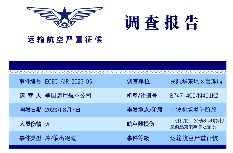同日,宁波机场发布情况通报确认,8月7日下午,宁波栎社国际机场发生1起外航货机着陆后滑行偏出跑道事件。1架卡利塔航空所属的波音747货机,完成着陆后进行机位滑行过程中偏出跑道。